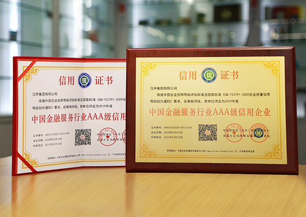 中国金融服务行业AAA级信用企业/全国315质量服务客户满意诚信金融企业汉声集团获中企国质信(北京)信用评估中心授予的“中国金融服务行业AAA级信用企业”及“全国315质量服务客户满意诚信金融企业”称号。2020-03-16