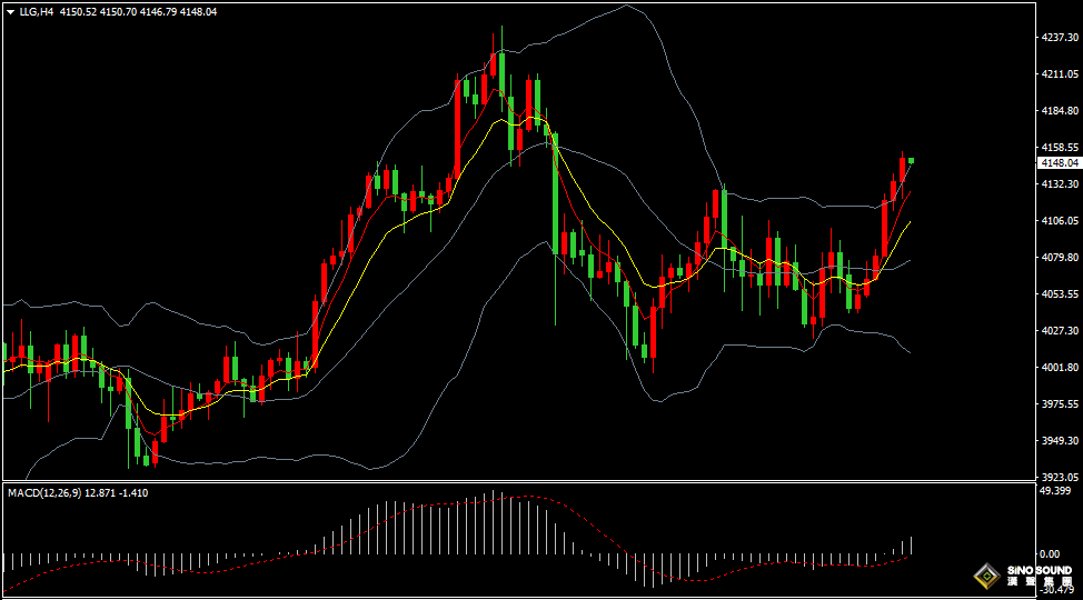 金價4小時圖看,金價布林帶張口再度打開,金價振盪上漲至布林上軌上方運行;短期均線EMA5與EMA10形成多頭向上,MACD指標動能柱轉為正值並逐步增加,RSI指標上升至62位置附近運行。日內短線操作建議,估計金價在4132-4158區間振盪運行,如突破該區間時,上行目標看4165、或4175附近;下行目標看4115、或4105附近。