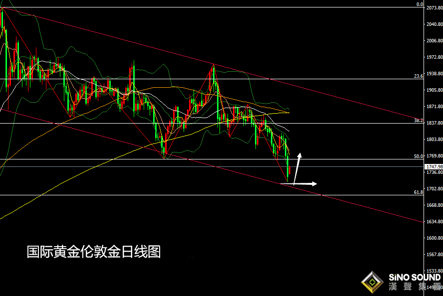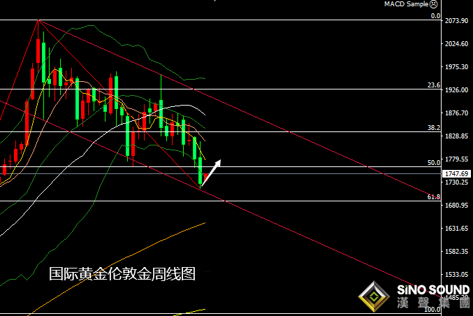 周線級別:金價一舉跌破云層下行邊支撐以及1760元關口,并較大力度的收于其下方,同時附圖指標的空頭信號也得到增強,故此后市仍有進一步走低的風險,預期關注100周均線處的1645美元。不過根據其2075美元而下的趨勢通道看,上周低點正觸及通道支撐,所以也應看好反彈;