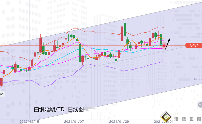 白銀TD:銀價自周五晚盤開于5456元/千克后,下行觸及5373元,隨后觸底反彈,延續至本周一已收復跌勢,并轉漲,觸底位置也是自4562而起的上升趨勢線支撐,故此產生買盤需求反彈也是預料之中,目前看中軌線對其產生一定壓力,但仍看好突破,上方可進一步看至5日均線附近。