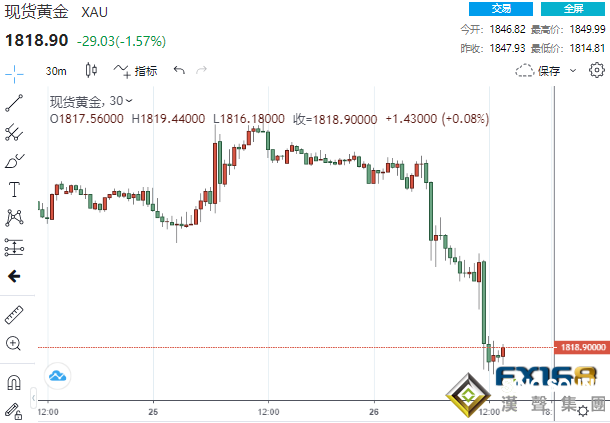 美市尾盤,現貨黃金收報1818.90美元/盎司,大幅下跌29.03美元或1.57%,日內最高觸及1849.99美元,最低觸及1814.81美元。