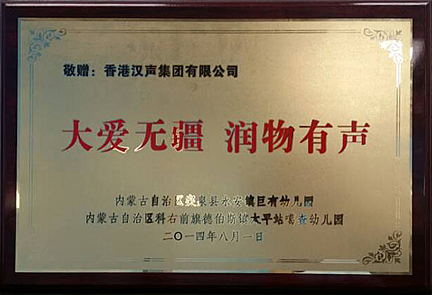 “窮則獨善其身,達則兼濟天下。”漢聲集團慈善也不甘為後,加入了振興民族事業的浪潮中,參加了全國民族地區、革命老區綜合援助計畫,捐助內蒙古貧困幼稚園,並獲授予“大愛無疆,潤物有聲”的榮譽。
